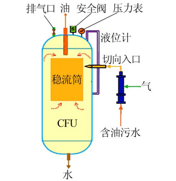 CFU工作原理如圖 1所示。采出水主體水流先經(jīng)自制的微氣泡發(fā)生器注入大量的微氣泡,然后沿切向入口進入浮選罐,在罐壁與內(nèi)部穩(wěn)流筒之間形成的環(huán)形空間內(nèi)產(chǎn)生旋流,旋流引起的離心力場驅(qū)使氣泡與油滴**黏附,黏附氣泡后的油滴與水的密度差進一步加大,進而加速浮升,提高了油水分離效率,實現(xiàn)對生產(chǎn)水的**處理,同時大大縮短水力停留時間,減小了處理設(shè)備的尺寸。其中,自行研制的微氣泡發(fā)生器利用微孔發(fā)泡機理,通過微孔對氣流進行連續(xù)剪切后經(jīng)水流沖刷而形成微氣泡,有效規(guī)避了常規(guī)氣泡發(fā)生方式能耗高、產(chǎn)生氣泡性能差、剪切乳化程度高等不足〔4, 5, 6〕,微氣泡發(fā)生器的優(yōu)越性能也為CFU除油效率的提高提供了保障